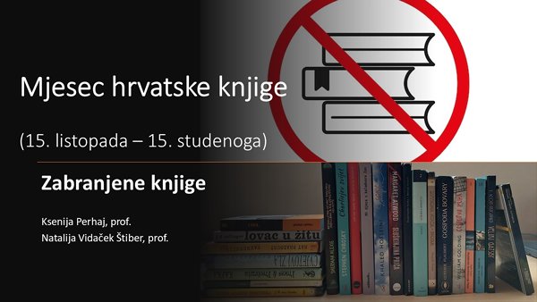 Ove školske godine Mjesec hrvatske knjige obilježio se predavanjem o zabranjenim knjigama. Predavanje su održale nastavnica hrvatskog jezika Natalija Vidaček Štiber i školska knjižničarka Ksenija Perhaj u petak 31. listopada, a predavanju su prisustvovali učenici 1. c, 2. a i 4. a razreda.